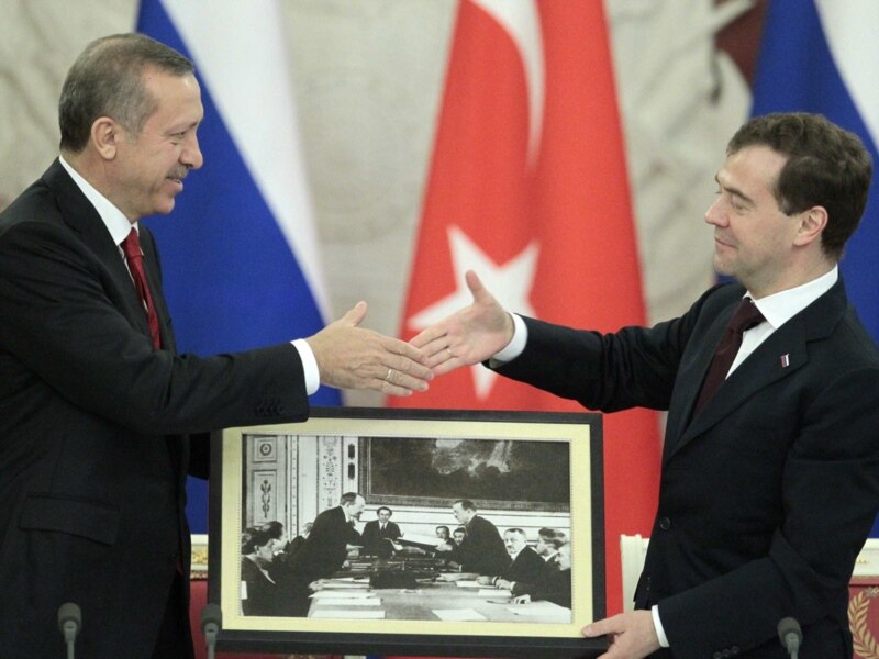 Orsýetiň prezidenti Dmitriý Medwedew (sagda) we Türkiýäniň premýer-ministri Rejep Taýyp Erdogan Moskwadaky metbugat konferensiýasynda, 16-njy mart, 2011-nji ýyl.