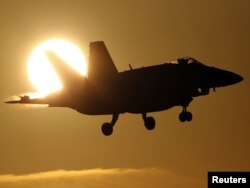 Kanadanyň CF-18A harby uçary NATO-nyň Trapanidäki Birgi bazasyna gonýar, Sisiliýa adasy, Italiýa, 21-nji mart.