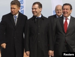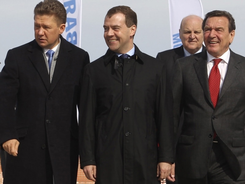 “Gazpromyň” başlygy Alekseý Miller (çepde), Orsýetiň prezidenti Dmitriý Medwedew (ortada) we Gerhard Şröder “Demirgazyk akym” gazgeçirijisiniň gurluşygynyň açylyş dabarasynda, Wyborg, 2010-njy ýylyň 9-njy apreli.