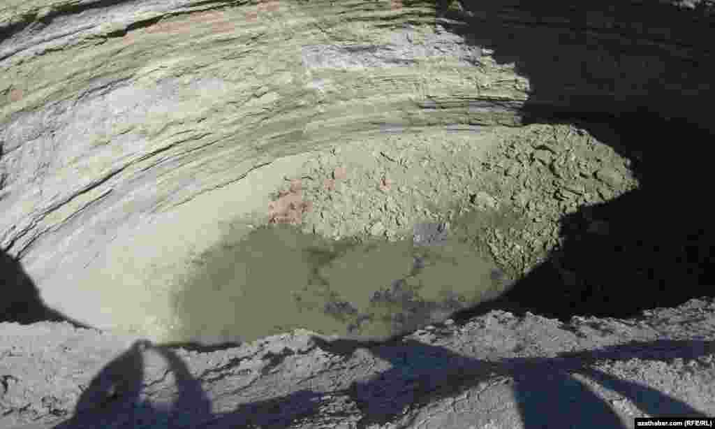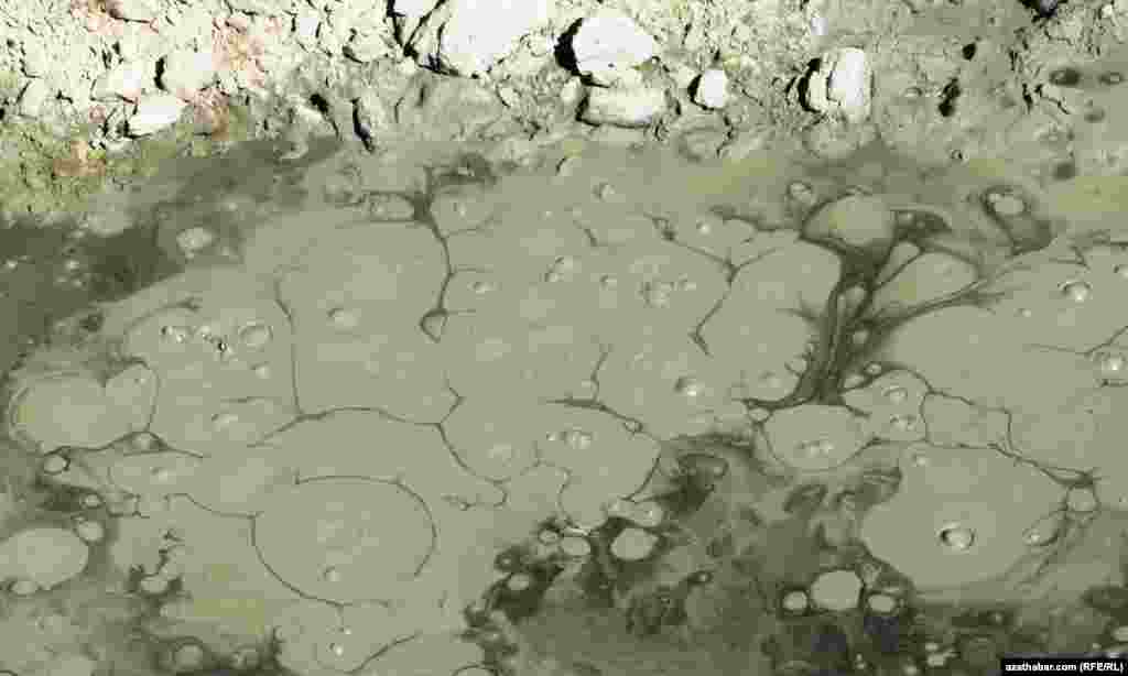 Garagumda Ymam Hoja gonamçylygynyň ýanyndaky gaz krateriniň düýbünde ýer astyndan çykýan gaz läbik suwda lokurdap dur.